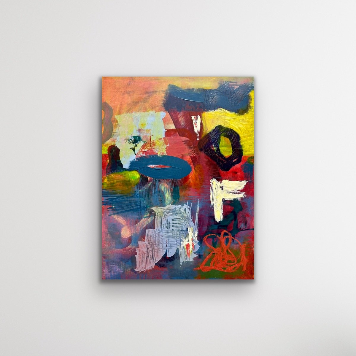 Acrylic and oil on wood, in black floating frame.