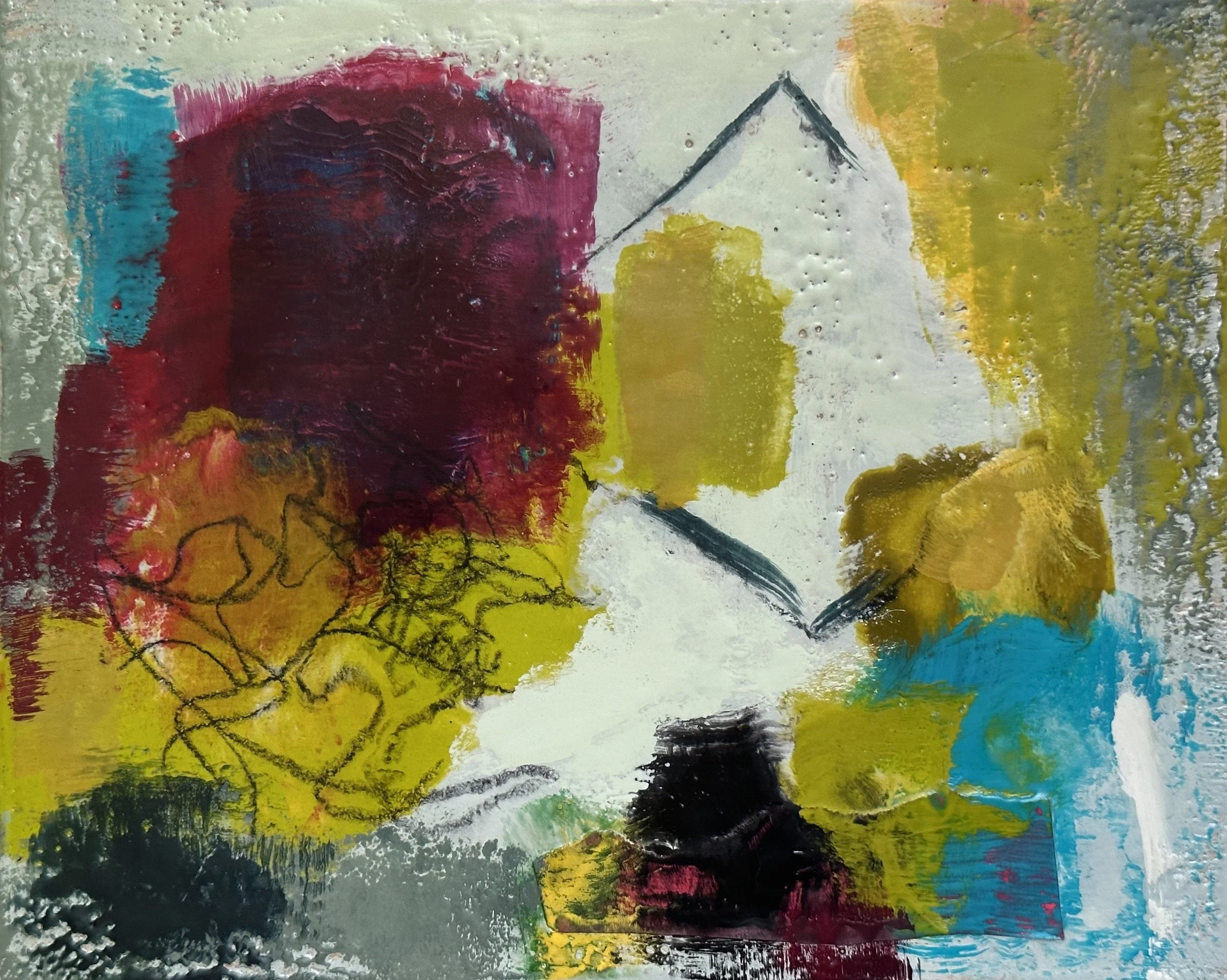 Anchored was created during a time of change and transition. There is a lot of intensity with vibrant shapes, movement, and graphic markings but the embedded shape in the right corner appears still and calm. This stillness and calm represent a goal for me of remaining anchored internally even when there is intense or chaotic energy around me.